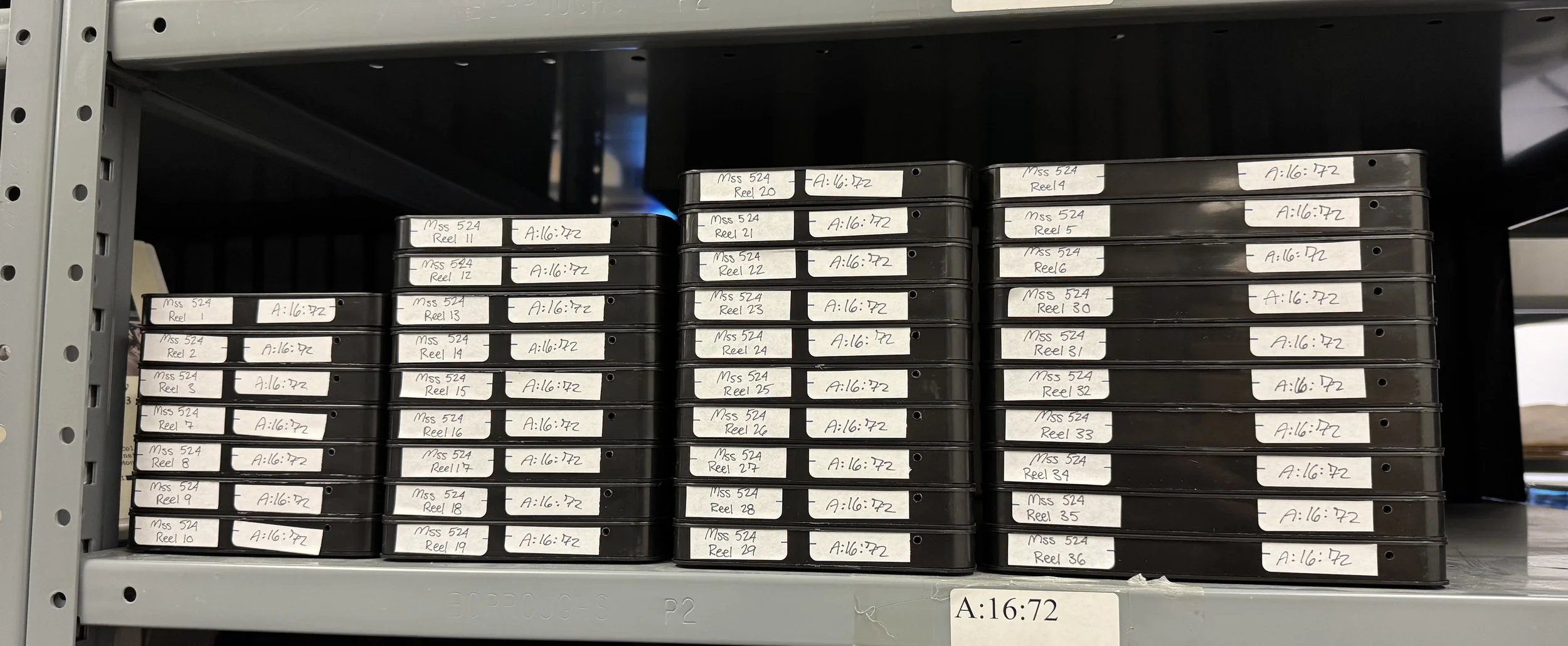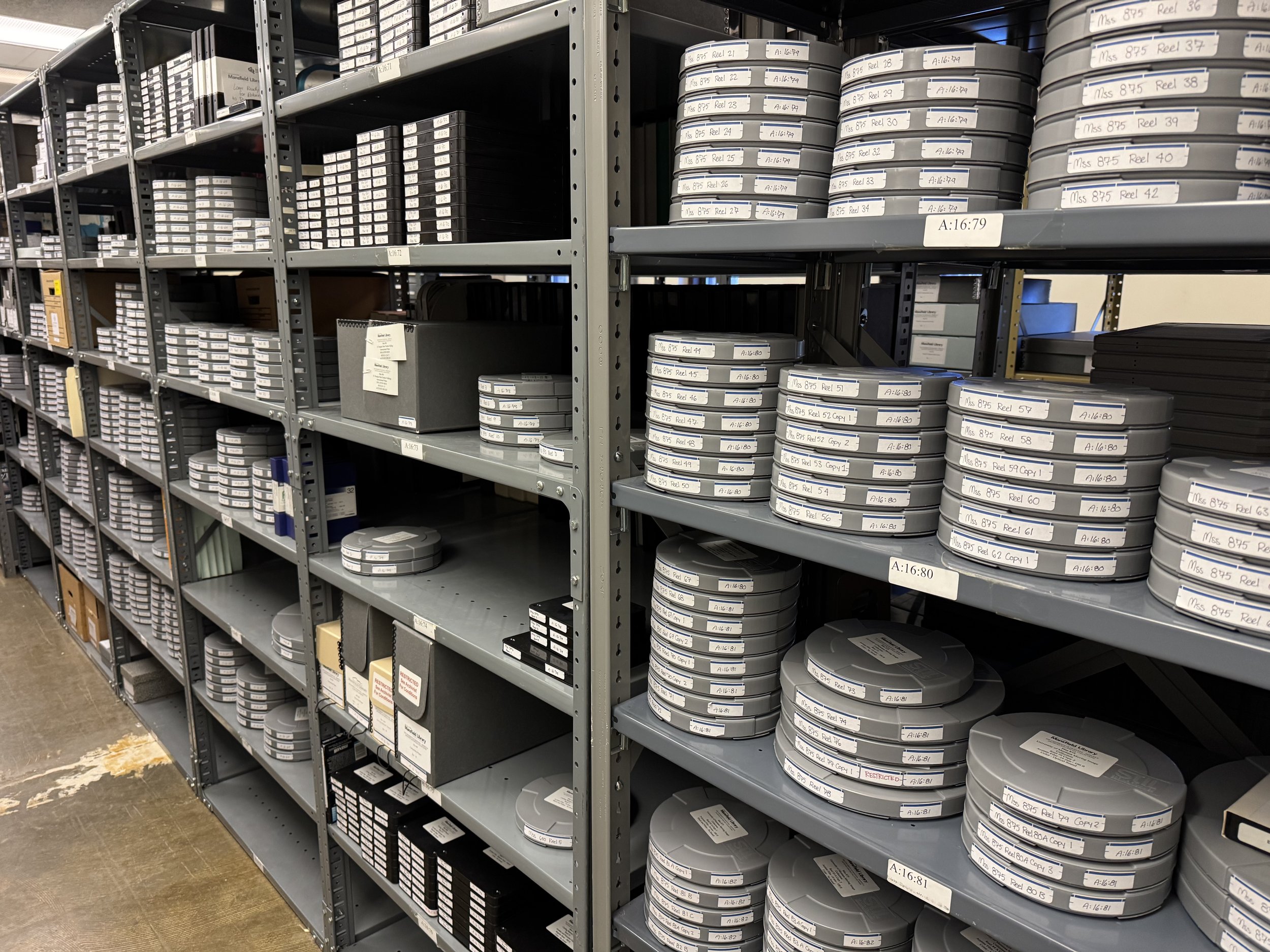 Film and media vault shelves, Archives and Special Collections, Mansfield Library, University of Montana. Courtesy Archives and Special Collections, Mansfield Library, University of Montana. Image subject to copyright.